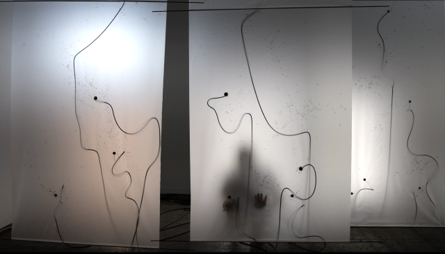Tissu vinyle translucide, clous, acier, piezos, corps